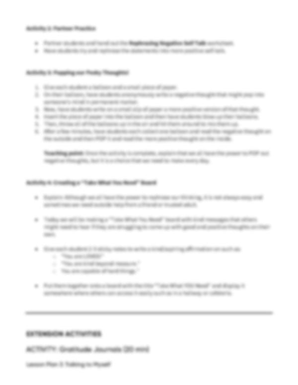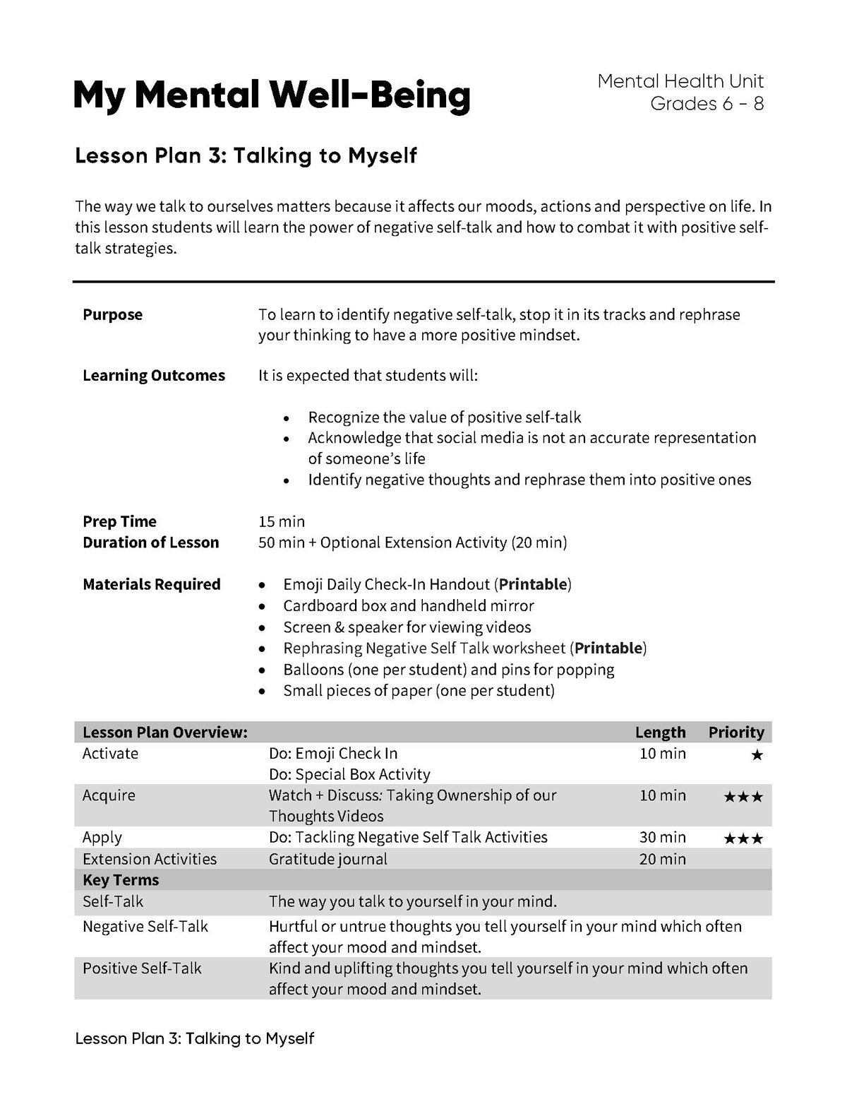 The way we talk to ourselves matters because it affects our moods, actions and perspective on life. In this lesson students will learn the power of negative self-talk and how to combat it with positive self-talk strategies.