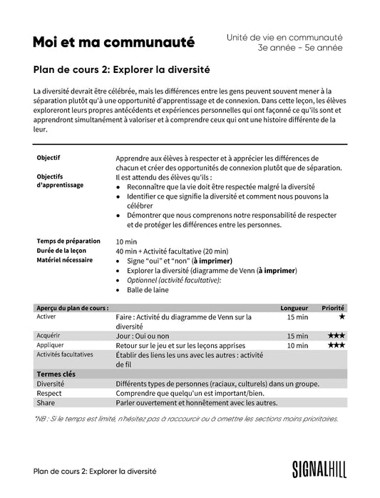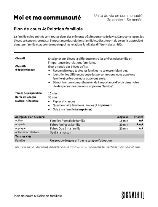 Nos communautés ont un impact sur ce que nous devenons. Dans ce module, les élèves apprendront ce que signifie vivre en communauté en apprenant en outre à apprécier les autres, à valoriser la diversité, à résoudre des problèmes et à aimer leur famille.