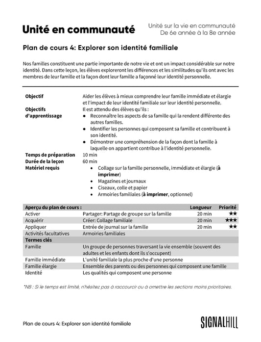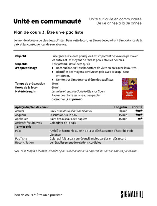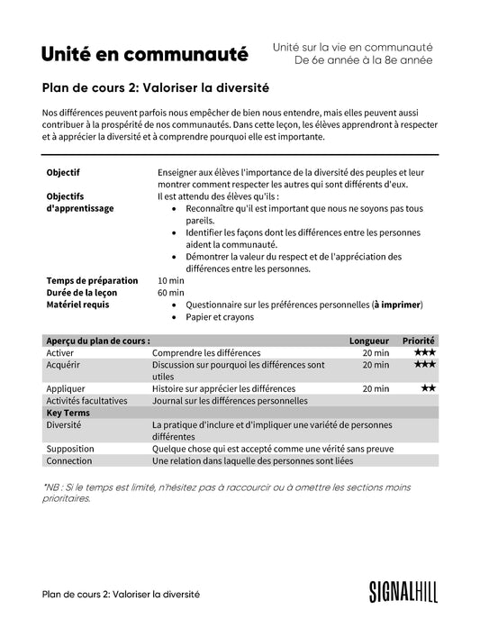Vivre au sein d'une communauté implique d'apprendre à connaître les similitudes et les différences. Dans ce module, les élèves apprendront à créer l'unité dans leur communauté en apprenant à apprécier les autres, à valoriser la diversité et à être un agent de la paix.