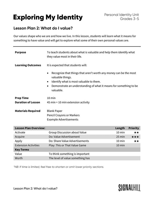 Lesson Plan 2: What Do I Value?