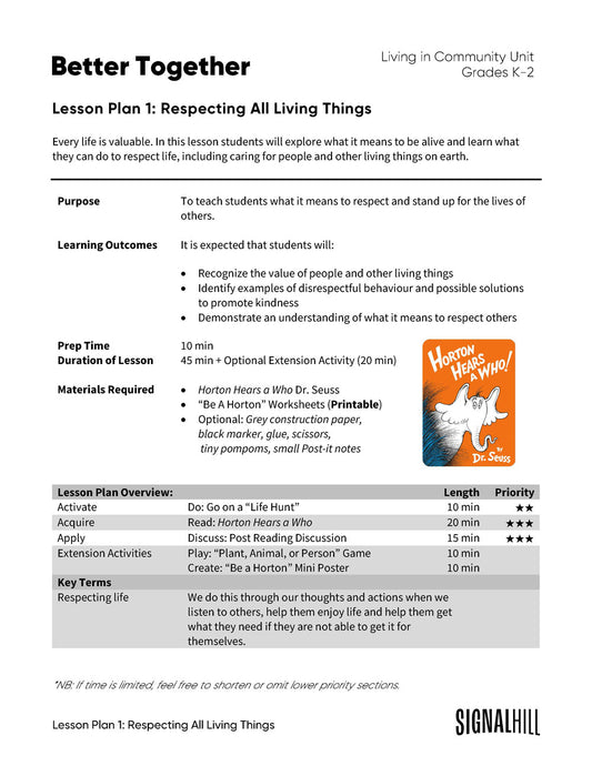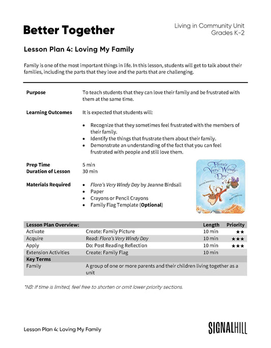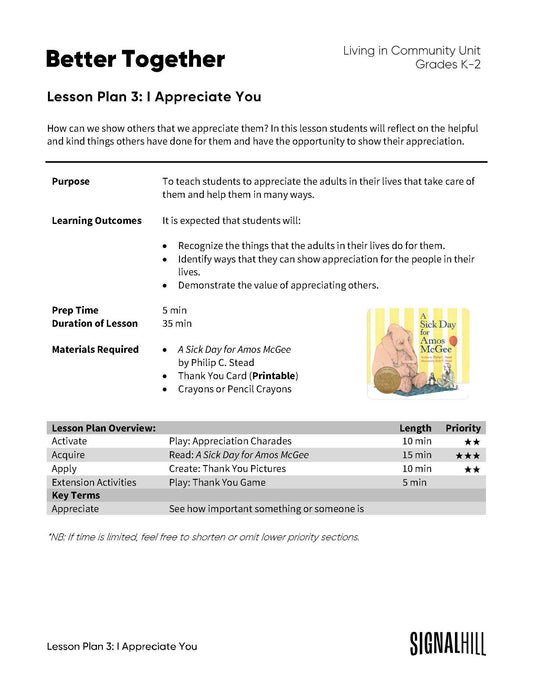 Life is better when we work together. In this unit students will learn about the importance of living in community with lessons covering topics such as respect, diversity, appreciation, and family.