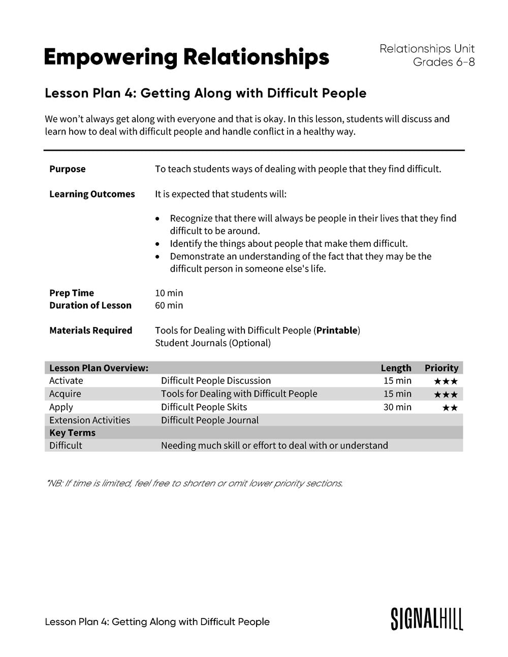 We won’t always get along with everyone and that is okay. In this lesson, students will discuss and learn how to deal with difficult people and handle conflict in a healthy way.