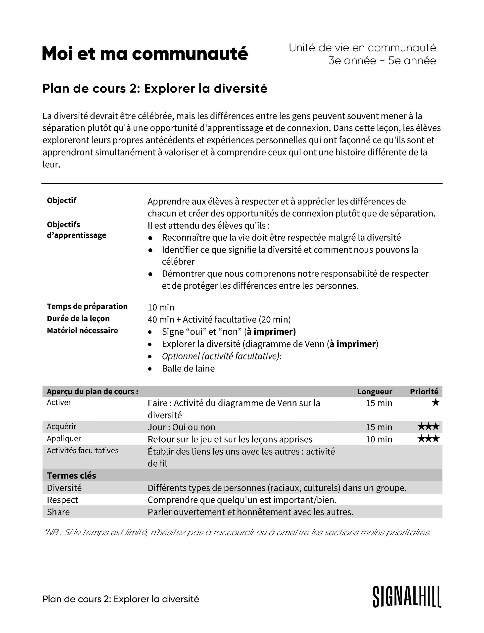Nos communautés ont un impact sur ce que nous devenons. Dans ce module, les élèves apprendront ce que signifie vivre en communauté en apprenant en outre à apprécier les autres, à valoriser la diversité, à résoudre des problèmes et à aimer leur famille.