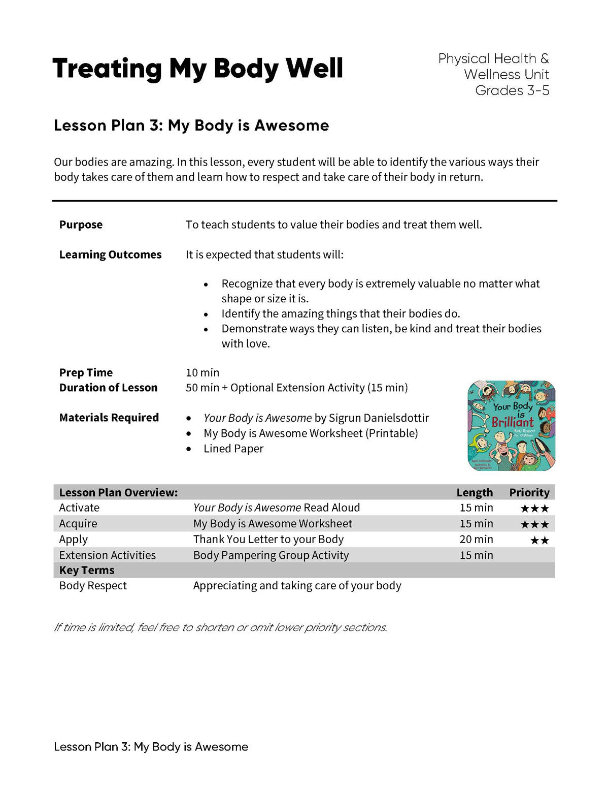 Our bodies are amazing. In this lesson, every student will be able to identify the various ways their body takes care of them and learn how to respect and take care of their body in return.