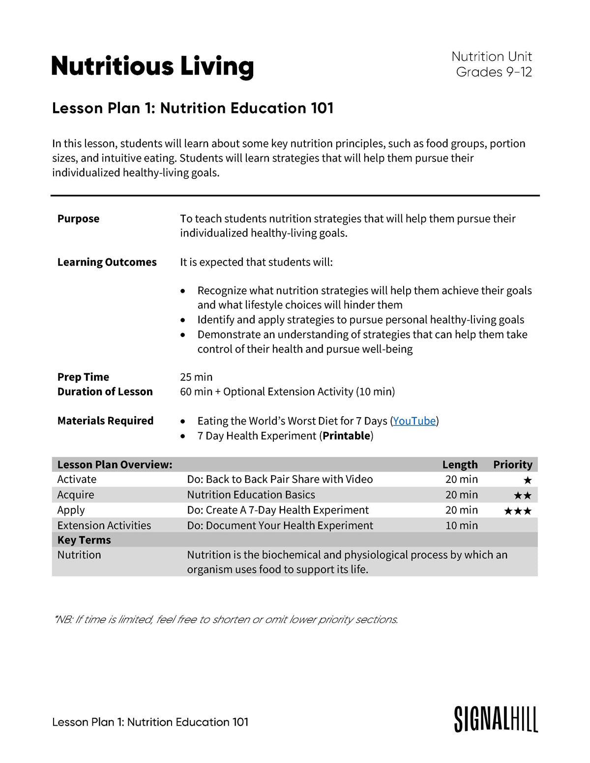 In this lesson, students will learn about some key nutrition principles, such as food groups, portion sizes, intuitive eating, and fasting. Students will learn strategies that will help them pursue their individualized healthy-living goals.