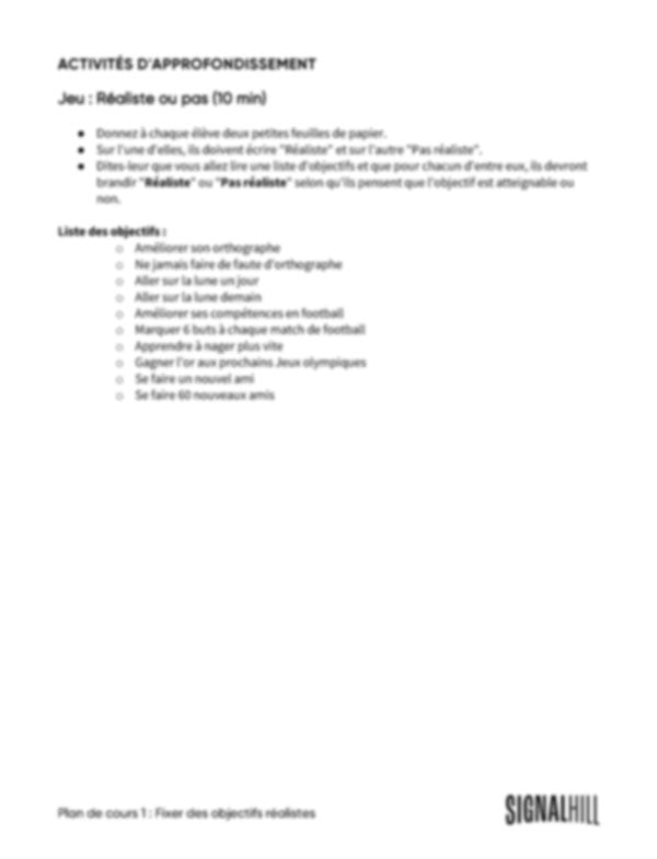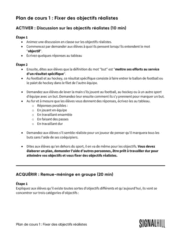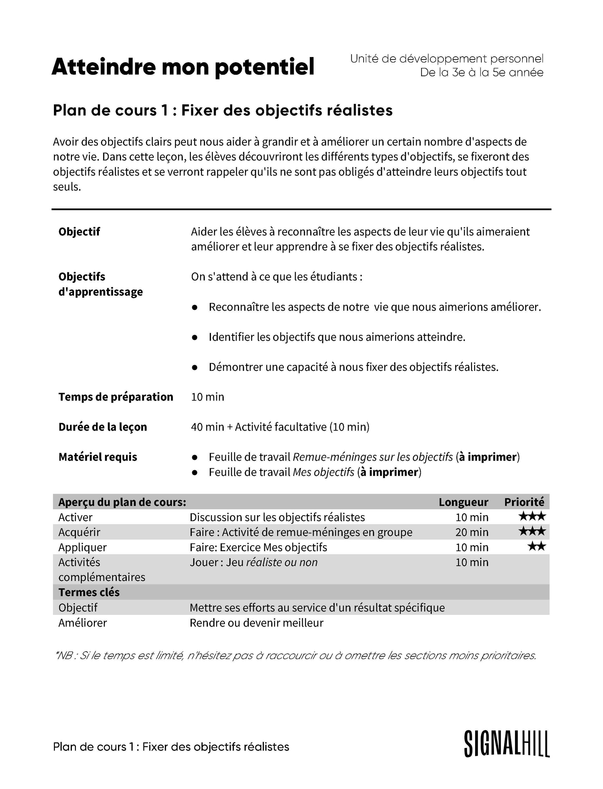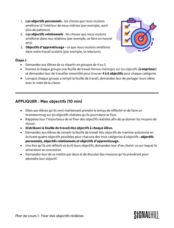 Avoir des objectifs clairs peut nous aider à grandir et à améliorer un certain nombre d'aspects de notre vie. Dans cette leçon, les élèves découvriront les différents types d'objectifs, se fixeront des objectifs réalistes et se verront rappeler qu'ils ne sont pas obligés d'atteindre leurs objectifs tout seuls.