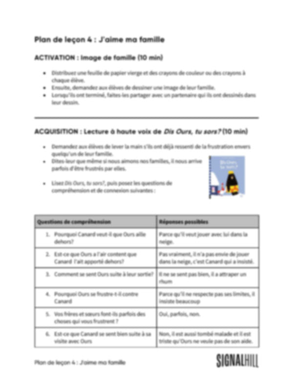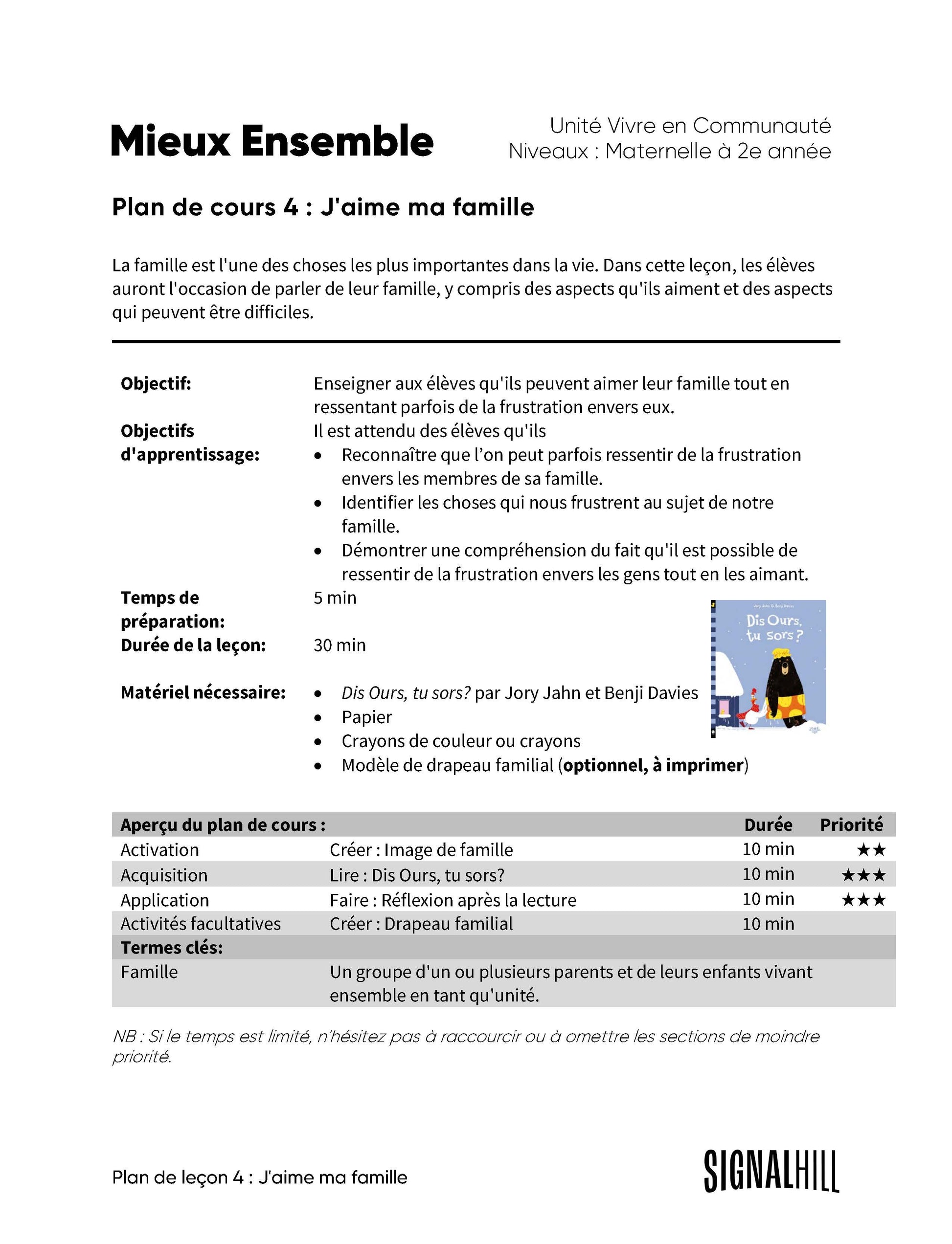 La famille est l'une des choses les plus importantes dans la vie. Dans cette leçon, les élèves auront l'occasion de parler de leur famille, y compris des aspects qu'ils aiment et des aspects qui peuvent être difficiles.