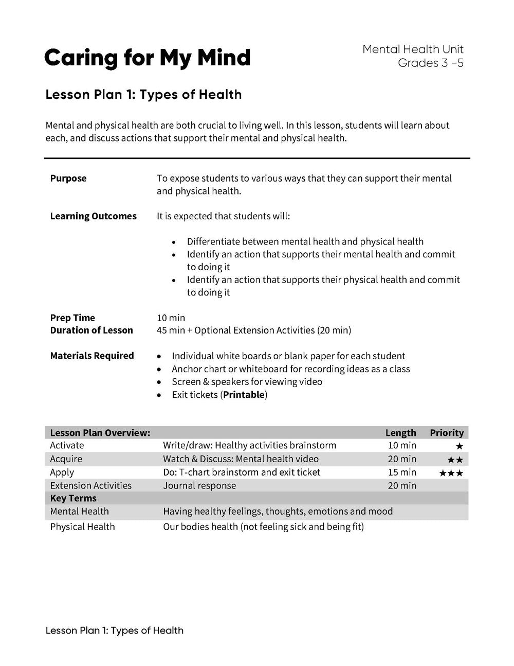 Mental and physical health are both crucial to living well. In this lesson, students will learn about each, and discuss actions that support their mental and physical health.