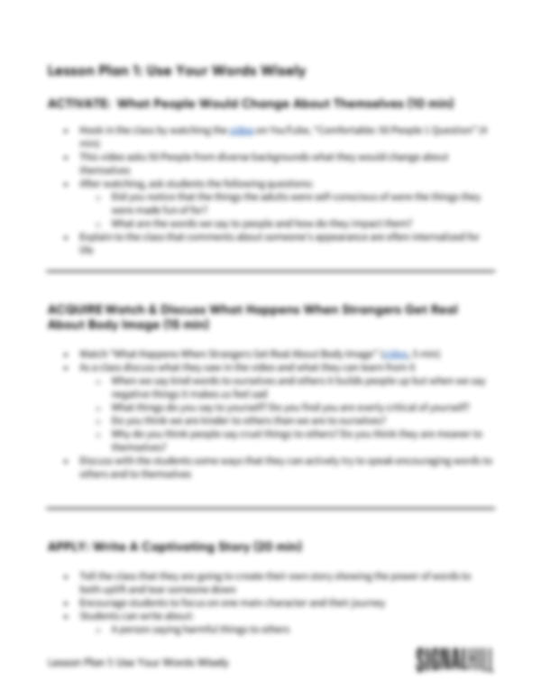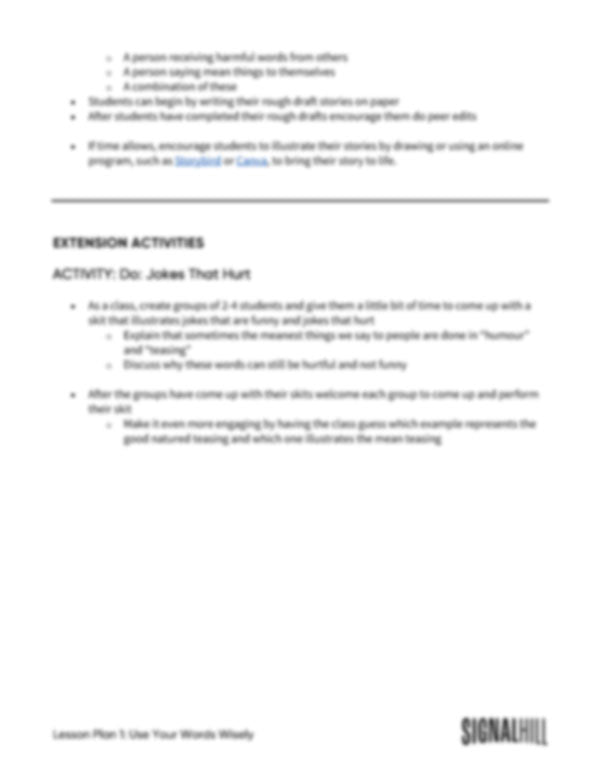 - Identify and explore ways to speak words of encouragement and love instead of negativity and hurtful teasing.
